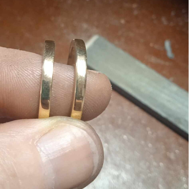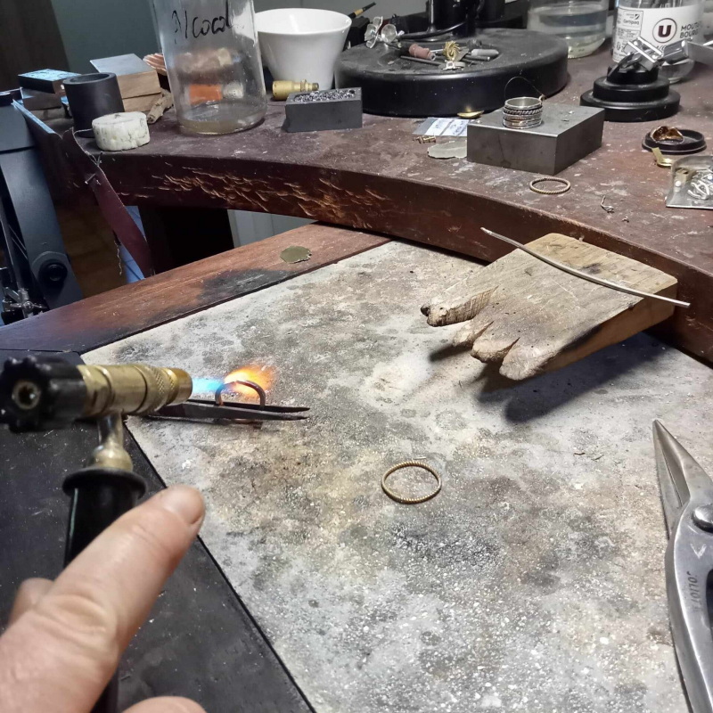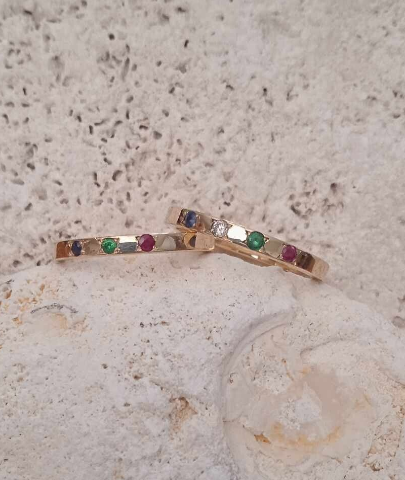 Réalisation anneaux mère, fille, or 18 carats, et pierres de couleurs, en utilisant l'or et les pierres de ma cliente.
